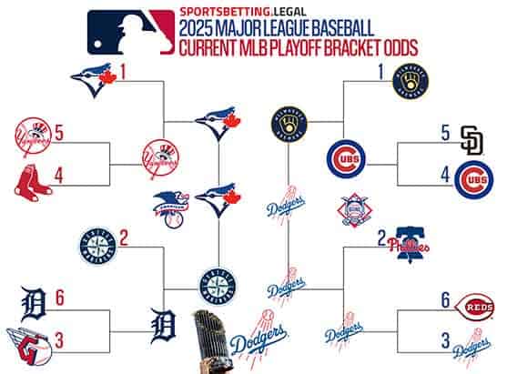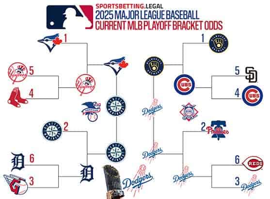 We compare the baseball playoff odds across all legal sports betting sites and place those projected outcomes inside an actual Major League Baseball postseason bracket and update it weekly so that gamblers are armed with the information needed to make a legit wager.