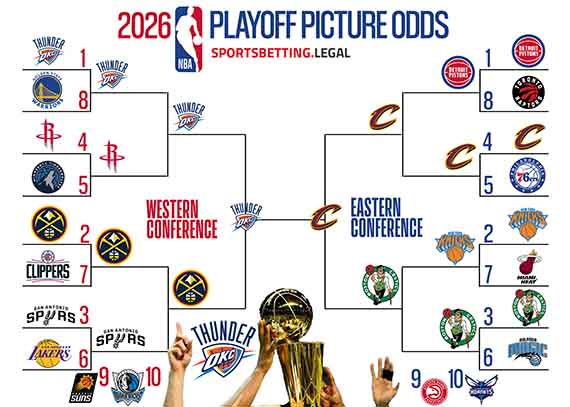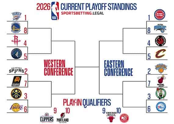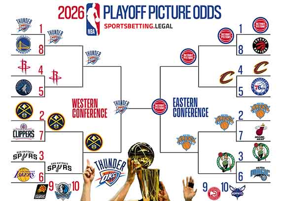 The staff at Sports Betting Legal uses a combination of individual game lines, division futures, conference futures, odds to win the NBA Finals, and current standings to calculate the 2026 post-season playoff picture bracket.